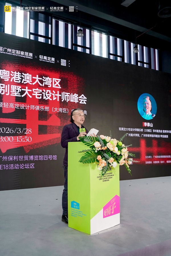 轻高定设计师俱乐部(大湾区)学术委员会 首席学术顾问、广州美术学院与广州华商学院环境设计专业教授 李泰山从学术视角出发,为盛典致辞。他强调,轻高定,不是简单的“轻奢 + 定制”,而是以用户为核心,用新家具、新科技、新美学重构大宅生活的底层逻辑。新家具是轻高定的功能载体;新科技是轻高定的效率引擎;新美学是轻高定的精神内核。轻高定不是一个短暂的风口,而是中国高端住宅设计的必然趋势。它要求我们既要扎根传统,又要拥抱创新。